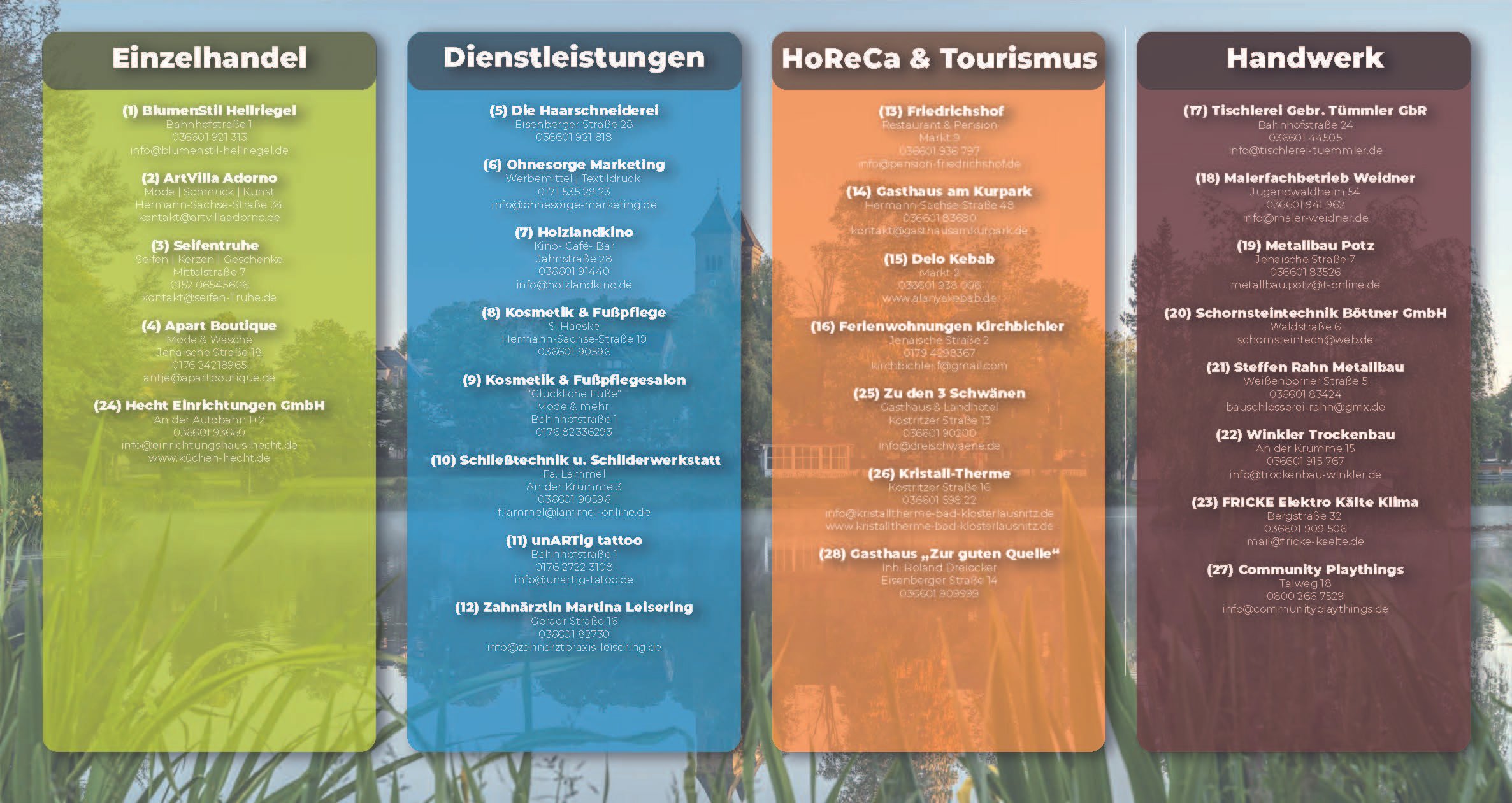 Mit Einzug in den Gemeinderat im Jahr 2019 hat die FWG intensiv an der Erstellung eines Gewerbeführers für Bad Klosterlausnitz gearbeitet. Aufgrund von Verzögerungen aufgrund Corona, Wechsel des Grafik-Dienstleisters und einer Vielzahl notwendiger Abstimmungen konnte der finale Flyer im Zuge des Gewerbestammtisches am 24.10.2023 vorgestellt werden. Insgesamt konnte man trotz intensivster Bemühungen in Form von Einladungen, Anschreiben etc. lediglich 1/3 der ortsansässigen Einzelhändler, Gewerbetreibenden und Handwerker von dieser kostenfreien Werbemöglichkeit überzeugen. Diese Flyer sind im Rathaus, der KGZ, den Kliniken sowie der Bibliothek erhältlich. Natürlich kann man diesen auch digital bei uns oder auf der Webseite der Gemeinde Bad Klosterlausnitz downloaden. Eine 2. Auflage wird voraussichtlich im Jahr 2026 in Angriff genommen.